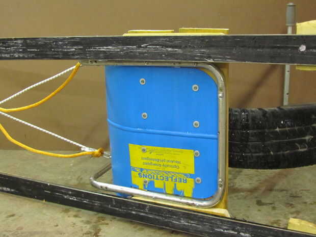 El tren de aterrizaje mantiene nieve acumule en la parte superior del patín y proporciona elevación sobre muros de contención. Comencé cortando la forma que necesitaba de un barril de 55 galones. Usar una pistola de calor, fue capaz de aplanar la parte trasera, pero el frente curvado a la izquierda. Se lo montaron en la parte inferior de la base con tornillos y arandelas.