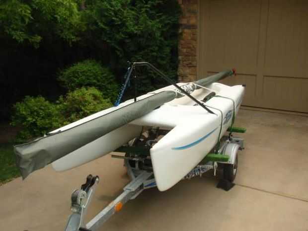 Utilizo dos líneas de proa y popa y por lo tanto enganche de dos independientes trinquete del camionero para sujetar firmemente mi mástil en el barco. Podría tomar un poco de tiempo para establecer las dos líneas la primera vez, pero después de eso les dejo las líneas en lugar en el remolque, liberando solamente el lado trinquete para poner el barco en el agua. Esto significa que, después de ajustar las líneas de la primera vez, después de eso con este enganche para asegurar el mástil en el remolque es más rápido que el uso de las correas del trinquete. El sistema también es suave para mi mástil y vela.