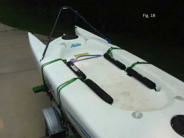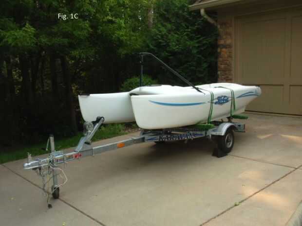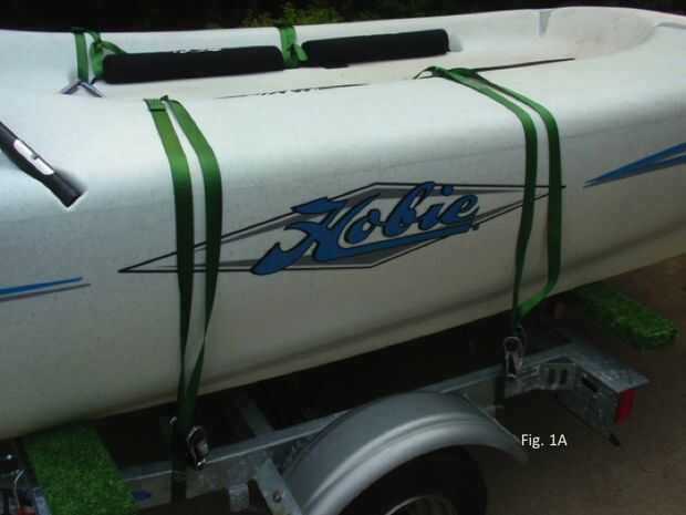 El Hobie Bravo se coloca en su acoplado como se muestra en las figuras 1a, 1b y 1C. Cuatro correas del trinquete verde se utilizan para sostener el Hobie Bravo en su remolque. Cada correa se coloca alrededor de un casco a través de un agujero correspondiente de echar por tierra en el habitáculo. Cuando se navega, el agua drena a través de estos agujeros.