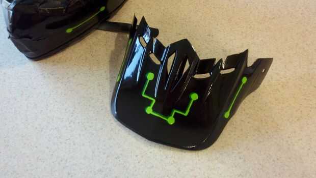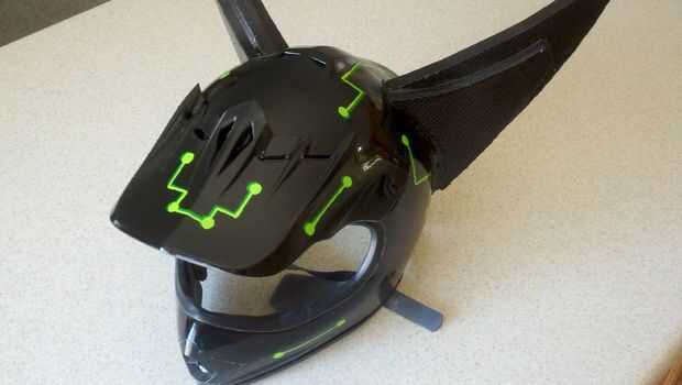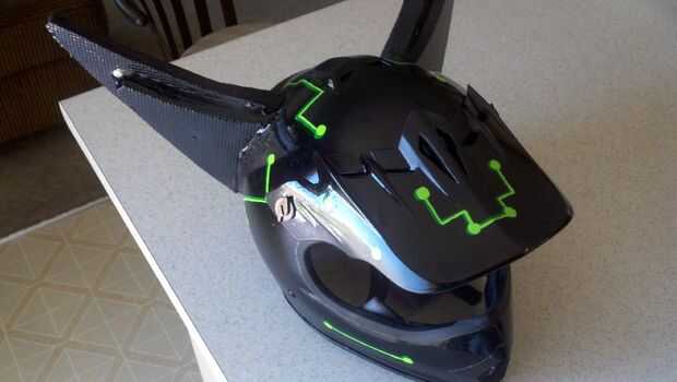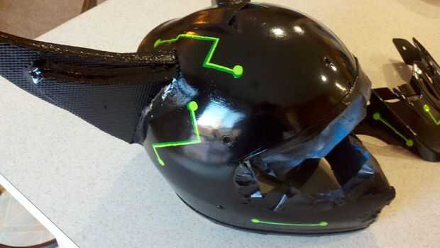 Nuestro diseño está "basado" en la armadura de Hyperflux. No pretende ser una copia exacta, así que le pregunté a mi hijo qué quería el traje basado en el color. Eligió el verde. Por alguna razón vi el casco negro y visualizar un diseño de tipo de placa de circuito. No pueden jive con cualquiera del juego, pero creo que funciona.