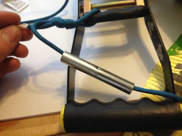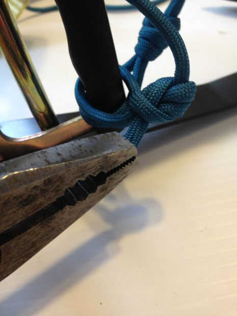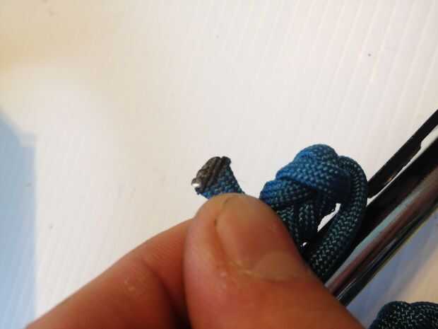 1. una vez que se ata un nudo pase el otro extremo de la cuerda a través del conector de poste de la tienda.