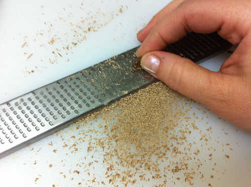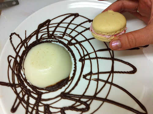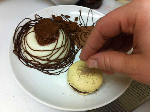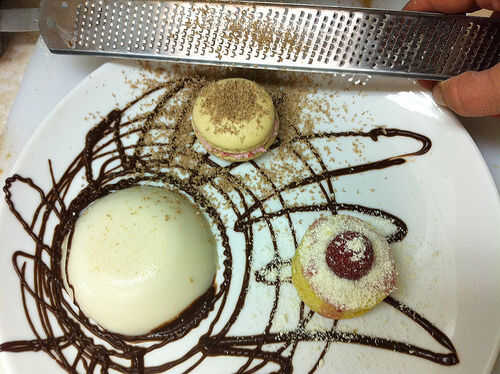 Afeitado algún chocolate con leche sobre el macaron con un microplane.