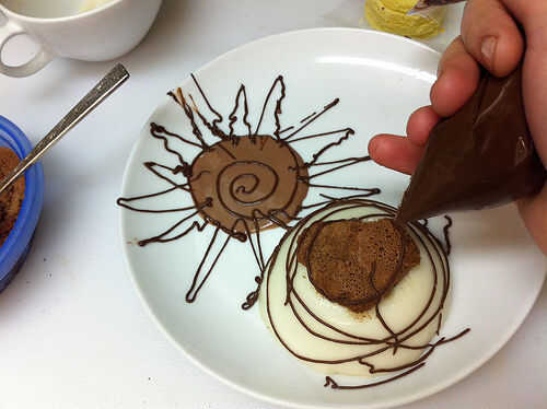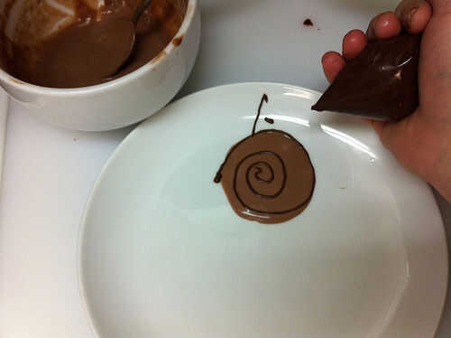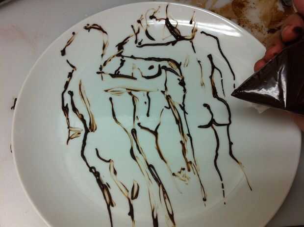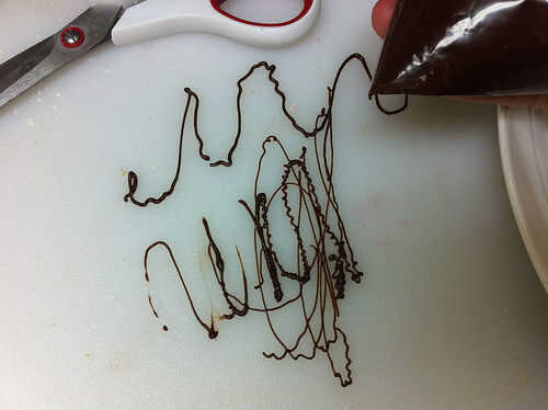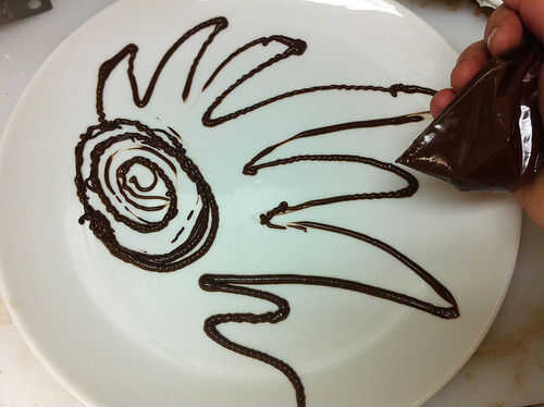 Tomar la salsa de cerezas chocolate oscuro y práctica de dibujo con él, ya sea en una placa o alguna otra superficie. ADVERTENCIA: No desconecte la búsqueda segura si estás haciendo una búsqueda en google imágenes para encontrar inspiración para el diseño de fondo chocolate, especialmente si su búsqueda incluye la palabra "trío". O, si opta por ignorar mi Consejo, no de dibujo en las placas en 4:00 después de mirar imágenes, dijo. Miré mis dibujos de la placa después de conseguir un sueño y se dio cuenta que incluso no pude publicar la mayoría de ellos a instructables sin arriesgarse a ser expulsado.