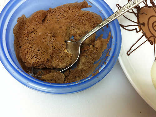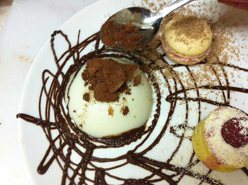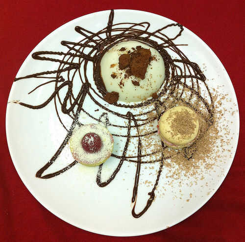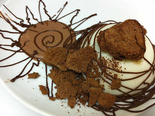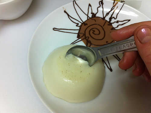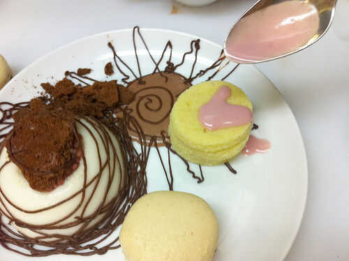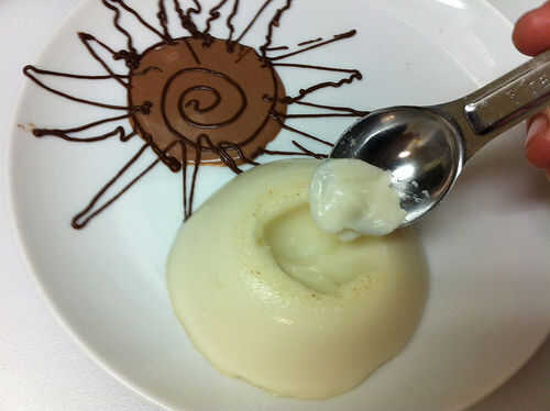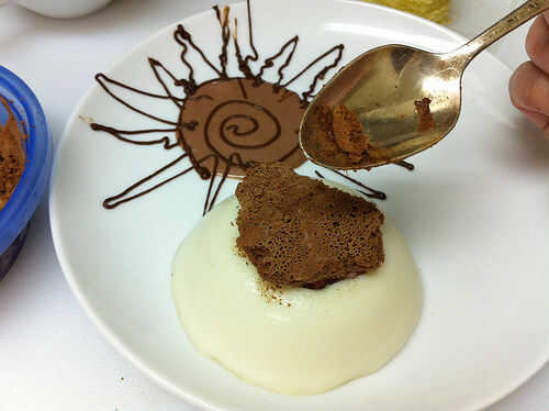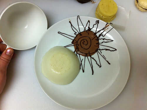 Sumerja el molde de la panna cotta en poco de agua caliente para aflojarlo, y luego desmoldar en el plato. Saque una pequeña muesca en la parte superior de la panna cotta y cuchara en algunas perlas de tapioca. Parte superior con espuma de chocolate congeladora - puede salvar la espuma congelada para el último, incluso esperar hasta que las placas están sobre la mesa - porque derrite tan rápido. La espuma no pierde la forma como derrite, pero no deben congelarse más y la espuma congelada tiene una textura realmente.