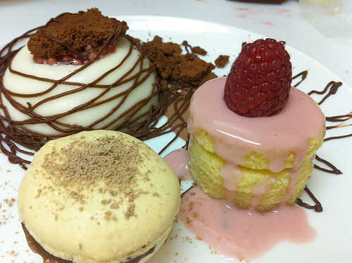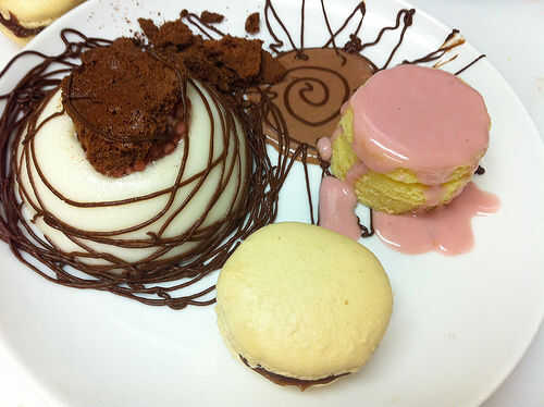 Colocar la torta de la almendra y el macarrón en el plato. Salsear algunos frambuesa salsa de chocolate blanco caliente la tarta de almendra. Coloque una fresa fresca sobre la salsa rosa, luego Espolvoree algunas había raspado de chocolate blanco.