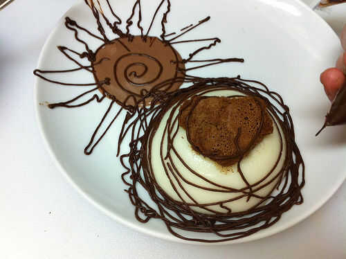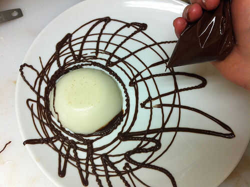 Cuchara de alguna salsa de chocolate con leche en el plato. Tubo de salsa de chocolate oscuro en la placa en cualquier patrón que desee. Patrones abstractos son menos propensos a ofender a sus invitados, especialmente si usted tiene una extraña tendencia a pintar gente desnuda cuando tenga salsa de chocolate en las manos.