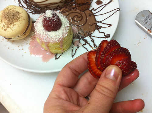 Si se desea, cortar una fresa de la punta (pero no tanto) en el extremo del tallo. Ventilador hacia fuera y colocar en el plato.