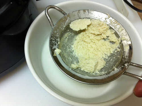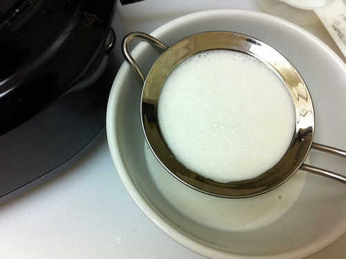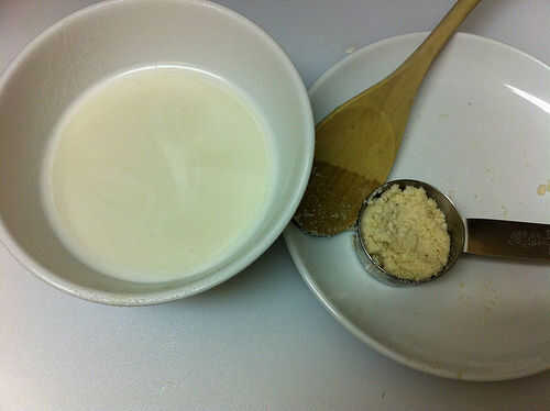 Usted puede ajustar las proporciones de harina de almendra y el agua, dependiendo de cómo de espesor desea su leche de almendras que.  Añadir agua y almendra comida a un procesador de alimentos o licuadora.  Mezcla, luego cuele la leche en un recipiente.  Excepto la almendra carnosa para las tortas de almendra.  Tenía un poco menos de 1/4 C de la pulpa de la almendra, que es lo que usé.