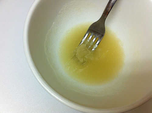 Rocíe ligeramente cazuelitas o tazas de té (cualquier plan sobre el uso de moldes) con aceite. Vacíe paquetes de gelatina en un recipiente y mezclar en el agua; Deje reposar 10 minutos hasta que los gránulos absorben el agua.