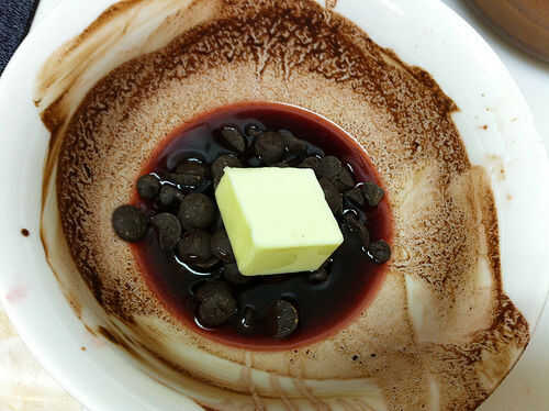 Fundir suavemente los trocitos de chocolate en el jugo de cereza y mantequilla. Remover bien y enfriar ligeramente. Añadir la lecitina de soja y mezcla bien, asegurándose de incorporar pequeñas burbujas poco para que la salsa de un sabor un poco más ligera. Vierta en una bolsa superior pequeña zip. Cortar una esquina muy pequeña de la bolsa cuando esté listo para la salsa.