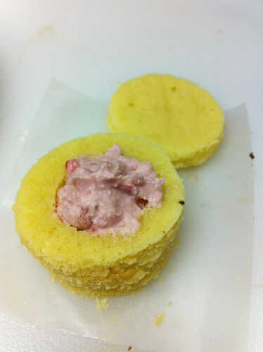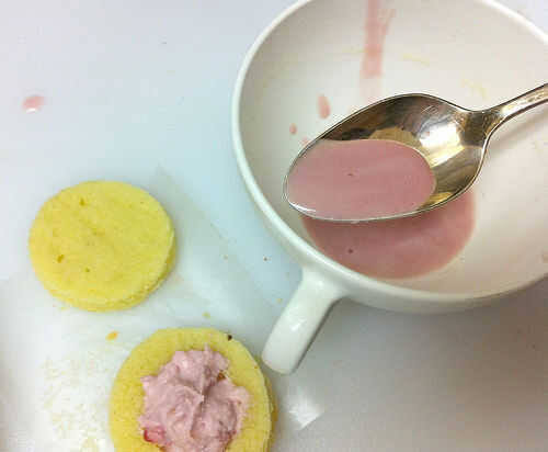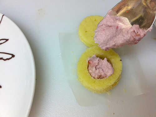 Utilice una cuchara para rellenar las tortas de almendra con la frambuesa mascarpone. Coloque las tapas sobre las tortas.