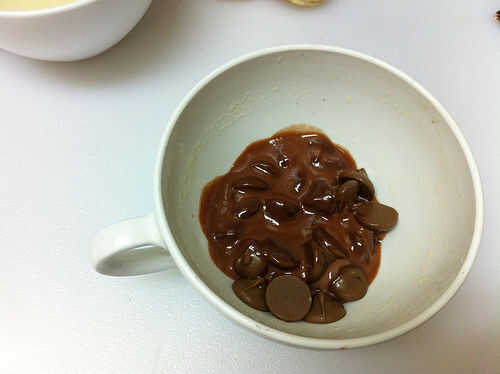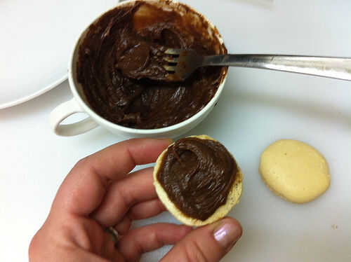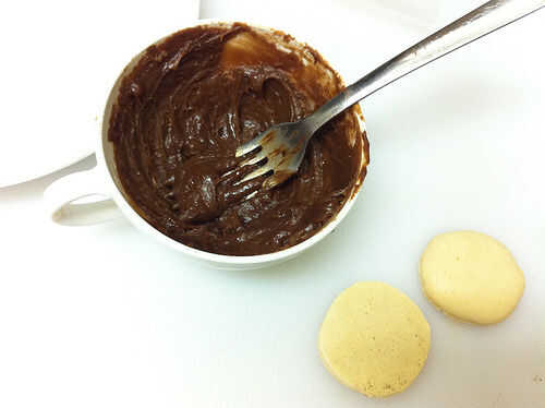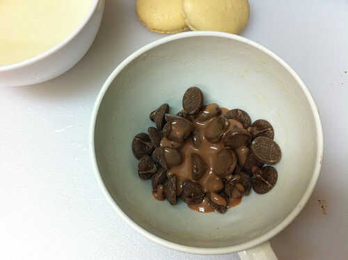 Derretir los chips de chocolate con la salsa y la mantequilla. Mezcle hasta liso; enfríe, luego revuelva otra vez. Extienda el relleno entre dos mitades de macarrón, los intercalando juntos. No utilice demasiado relleno o te aplasta hacia fuera cuando usted muerde la galleta.