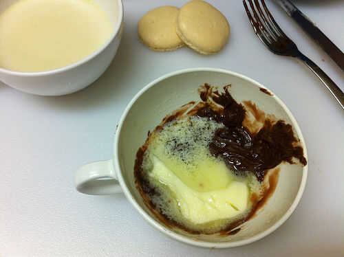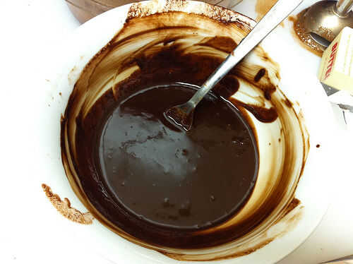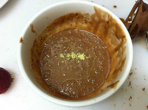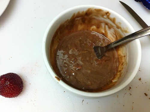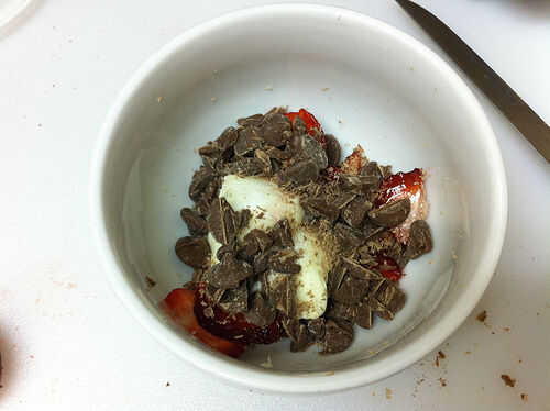 Fundir el chocolate con las fresas y la mantequilla. Mezclar bien, añadir lecitina de soja y mezcla un poco más, tratando de incorporar algunas burbujas para aligerar un poco la salsa.