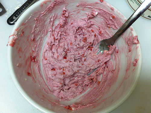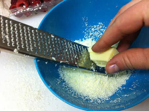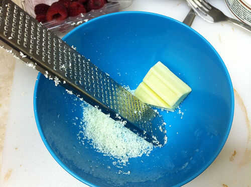 Rejilla blanca de 1 oz chocolate con un microplane. Añadir 1/4 de taza de chocolate blanco rallado al mascarpone, frambuesas y azúcar en un bol. Reservar el resto de los blancos de chocolate para decorar. Utilice un tenedor para hacer puré de las frambuesas en el resto de ingredientes y mezcle bien todo.