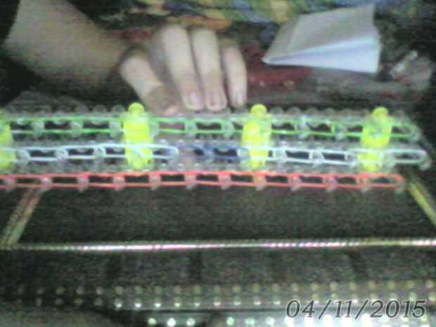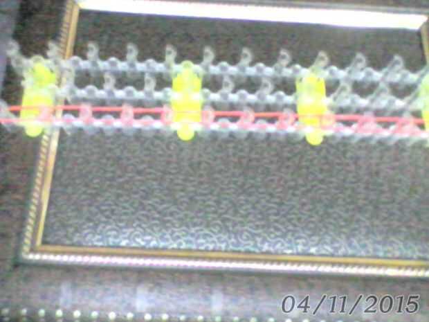 2. en el comienzo de la fila del medio colocando las gomas blancas en el mismo wayy como en punto 1. de la clavija quinto cuando se coloque la banda de goma blanca en la clavija de la sexta se coloque la banda de goma azul en thes IX peg desde séptimo peg en la clavija de la octava y la séptima. Ahora puede colocar las gomas blancas hasta el final.