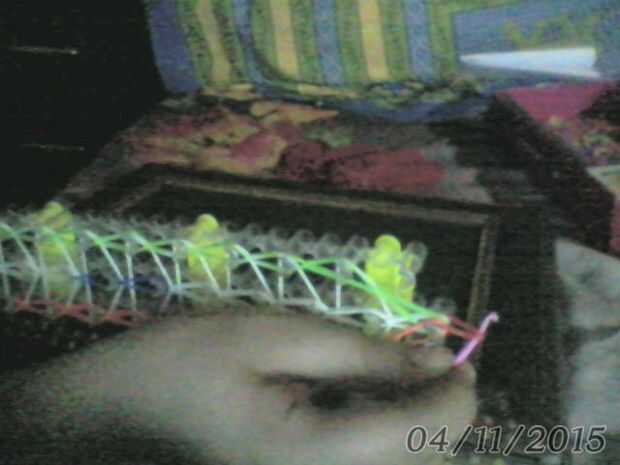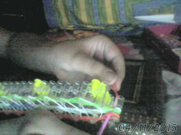 para tomar tomar una banda elástica y mantenerla por debajo de la última clavija que usted coloque las clavijas de izquierda y derecha rubeer. tomar el gancho desde dentro de ese último peg y adjuntar esa banda de goma en el gancho y revertir el gancho hacia fuera. Tenga cuidado de que su pulsera no cayó aparte y empezar a quitarse. con el gancho insertado.