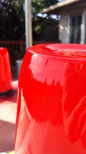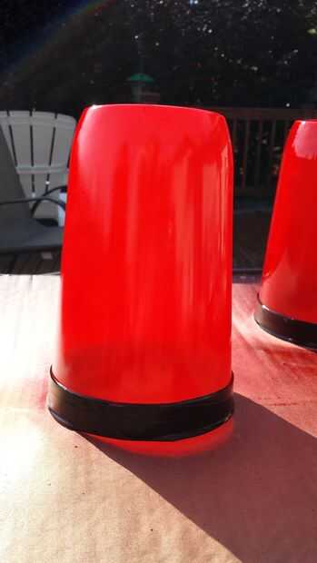 Cada una de las luces rojas se hizo tomando una jarra desde el almacén del dólar, cortando el mango y pintar con pintura roja transparente de una tienda de hobby. Una capa de brillo claro entonces fue agregada ya que el rojo puede llegar a chabacano. Luego tomar la plata cinta para envolver la base. Tomé una espuma círculo, conectado a la luz con tiras de cinta de conducto por un lado y luego pegar la espuma a la cabeza. De esta forma que usted puede levantar la cáscara ligera para poner una luz de LED intermitente dentro y cerrar hacia arriba.