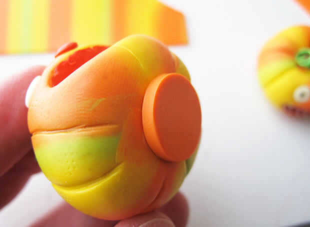 Tomar un trozo de arcilla naranja y pase a través de la arcilla de acondicionamiento de la máquina en la posición #2. Cortar un círculo de 5/8 de la arcilla y sujete la parte inferior de la calabaza. Esto aumentará tu cabeza de calabaza lo suficiente de su carrete para agregar algunos hilados decorativos. Ponga a un lado de una baldosa cerámica.