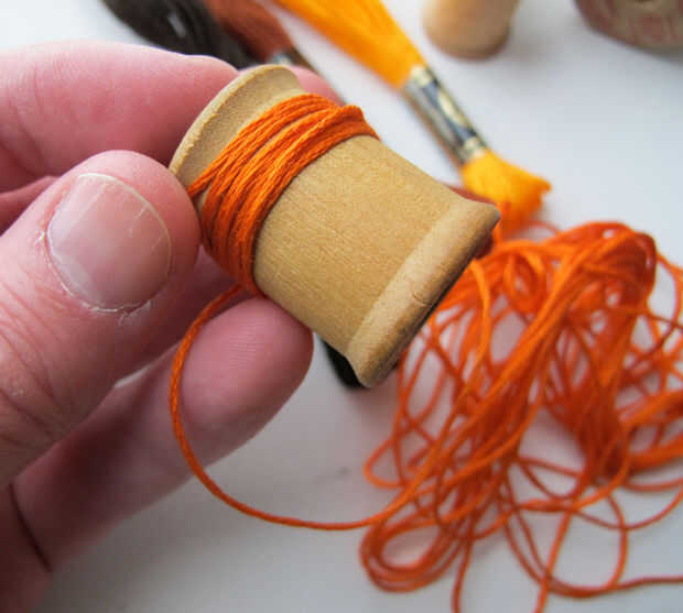 Elija su carrete vintage (puede usar cualquier tamaño pero para este proyecto se utilizaron 1 ¼ tamaño bobinas) elegir el hilo de color. Añadir algún pegamento para tela en el carrete y envuelva el hilo coloreado alrededor. Déjelo secar.