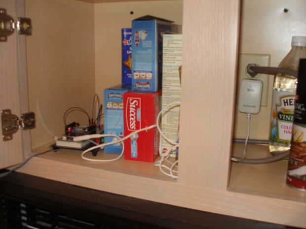 Tengo una toma de corriente en uno de los muebles cerca de mi nevera, que resultó para ser un gran lugar para ponerlo. Se remete lejos y fuera de la vista. Tengo una verruga de pared 12V 500mA de radio shack y un conector de barril de 5.5x2.1mm de centro positivo, tal como en una búsqueda rápida de google.