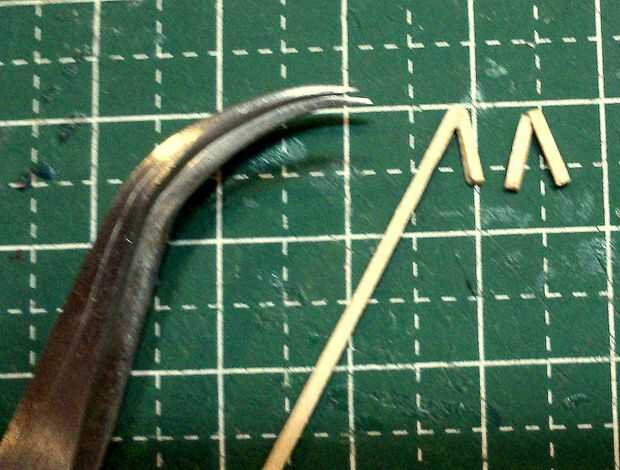 Palillos finos similares estaban pegados a una configuración en forma de V depende de los esquemas del paso 2. Necesitaba cuatro palillos de dientes en forma de V para el ala superior se monta y puntales del tren de aterrizaje.