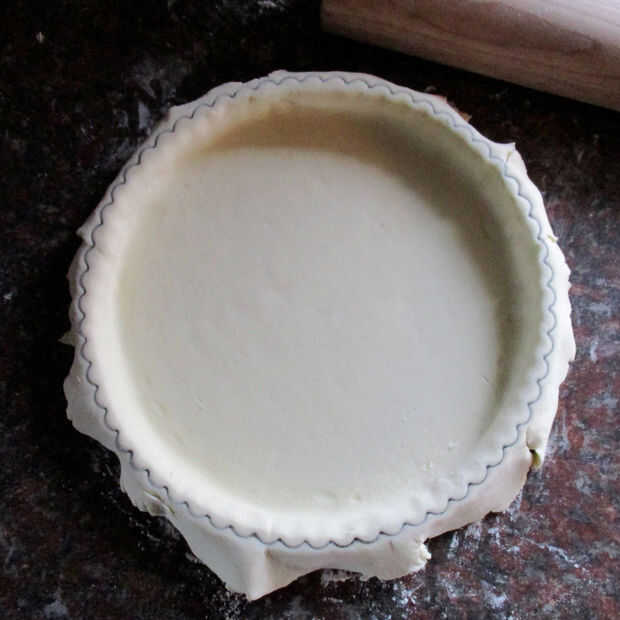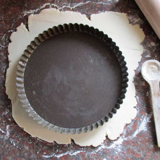 Retire la tarta masa del refrigerador y colóquelo en una superficie de trabajo limpia, bien enharinada. Usando un perno de balanceo, rodillo a 1/8 de pulgada de espesor y suavemente Coloque en una cacerola tarta acanalado de 9 pulgadas bien engrasada dejando la masa exceso cubra los bordes.
