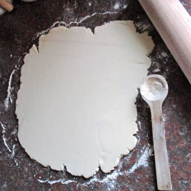 Usando un rodillo, el rodillo sobre los lados de la tarta de pan cortar masa exceso.