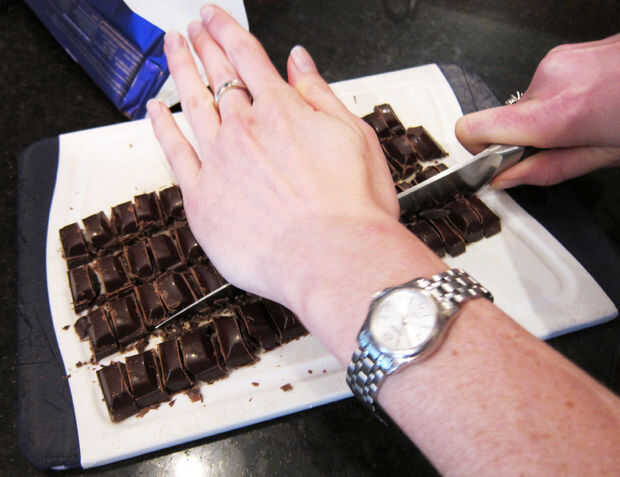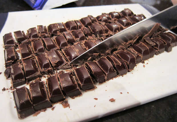 Corte los bloques de chocolate hasta el tamaño de la mitad de un cuadrado.