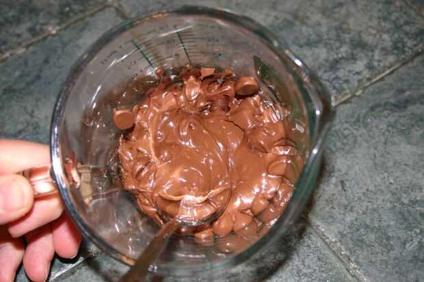 Poner 1 taza de chispas de chocolate semidulce y 1 taza de chips de chocolate con leche en un plato apto para microondas y calor durante 1 minuto en el microondas. Compruebe en el chocolate y el calor unos segundos más si es necesario. Ver chocolate con cuidado mientras está en el microondas para evitar la sobrecocción. Cuando las virutas de chocolate son parcialmente derretidas, sacar el plato del horno y revuelva con una cucharilla hasta que quede suave.