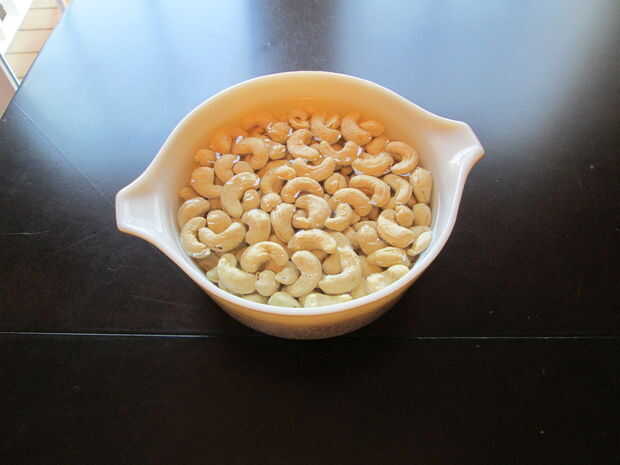 En primer lugar, empezar a remojo las castañas de cajú. Utilizar agua filtrada, si lo tiene, como las tuercas a beber en este líquido. Este paso es opcional, pero lo hace para una textura más cremosa. El remojo suaviza las tuercas y retira cualquier taninos (sabor amargo). Anacardos no requieren mucho de remojo - no más de 10-20 minutos, ya que son ya suave y cremoso.