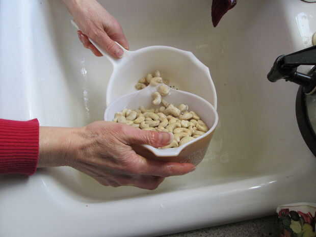 Si han empapado las pepitas de Marañón, debe ser listos para lavar. Vierte las pepitas de Marañón en un colador o filtro y enjuáguelo bien con agua. Apartar y montar el resto de ingredientes.