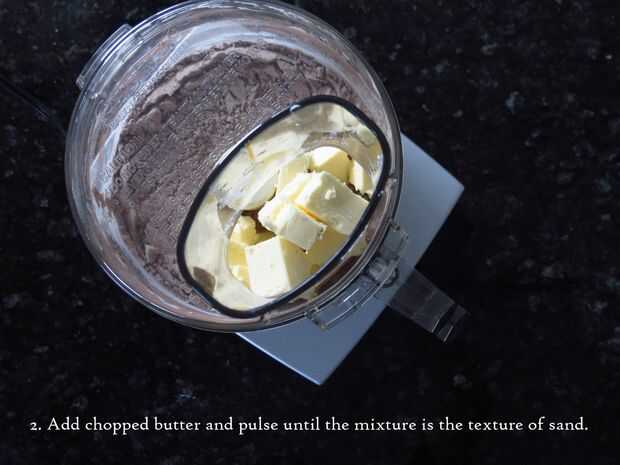 2. Añadir la mantequilla troceada y pulse hasta que la mezcla es la textura de la arena.