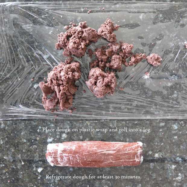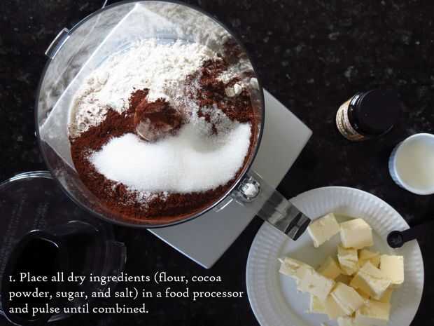 1. Coloque todos los ingredientes secos (harina, cacao en polvo, azúcar y sal) en un procesador de alimentos y pulse hasta combinado. Pasos 1-3 también se pueden hacer a mano.