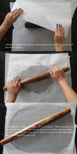 5. Saque la masa del plástico envuelva y coloque entre 2 hojas grandes de papel de pergamino. Enrolle la masa en un rectángulo grande, 1/8" de espesor. Asegúrese de que su masa es suave y el pergamino no ha arrugado, de lo contrario estas arrugas mostrará después la corteza se hornea. Refrigere la masa enrollada mientras se trabaja en el siguiente paso.