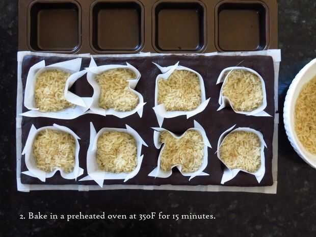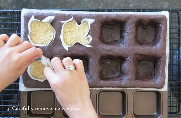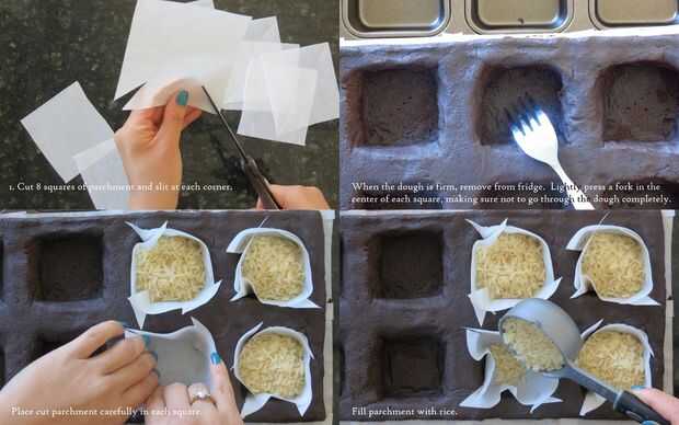 1. cortar 8 cuadrados de pergamino y ranura en cada esquina. Cuando la masa esté firme, sacar de la nevera. Presione ligeramente un tenedor en el centro de cada cuadrado, procurando no pasar por la masa completamente. Lugar corte pergamino cuidadosamente en cada plaza. Llenar el pergamino con arroz.