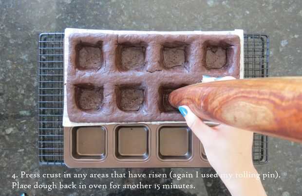 3. Retire cuidadosamente pesos de pie. Presione la corteza en todas las áreas que han aumentado (otra vez utilicé mi palote). Coloque la masa en el horno por 15 minutos.