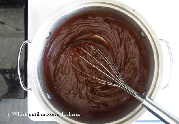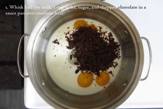 1. batir la mitad la leche, 3 yemas, el azúcar y chocolate picado en una cacerola sobre fuego medio.
