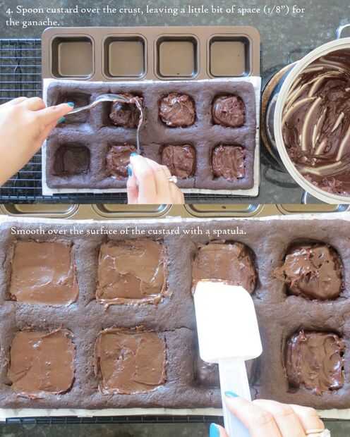 4. crema cuchara sobre la corteza, dejando un poco de espacio (1/8") para el ganache. Suave sobre la superficie de la crema con una espátula.