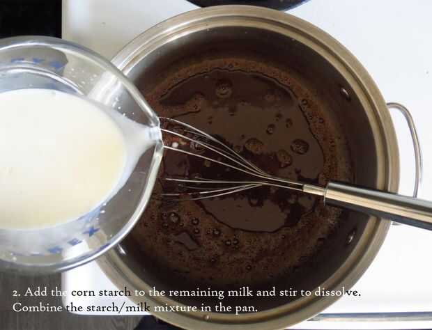 2. agregar el almidón de maíz a la leche restante y revuelva hasta para disolver. Combinar la mezcla de almidón y leche en la cacerola.