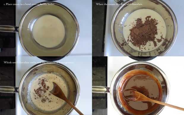 1. Coloque la crema en un bol sobre baño María. Cuando la crema esté tibia, agregue el chocolate. Bate hasta que el chocolate se derrite y la mezcla es homogénea.