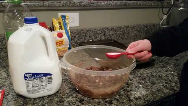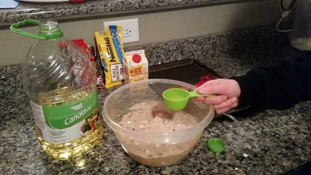 Después se mezclan los ingredientes secos, agregar 1/4 de taza de aceite de canola. Mix. Agregue 2 cucharadas de leche o agua. Opté por usar leche. Mix. Finalmente, añada 1 huevo. Y otra vez... de la mezcla.