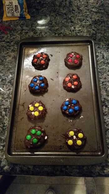 Tomar un tenedor y pulse suavemente las galletas para que sean planas en la parte superior. Presione ligeramente unos M & Ms en la parte superior les. Por supuesto no tienen que ser color cifrado, solo tengo TOC.