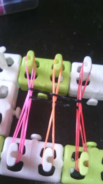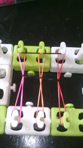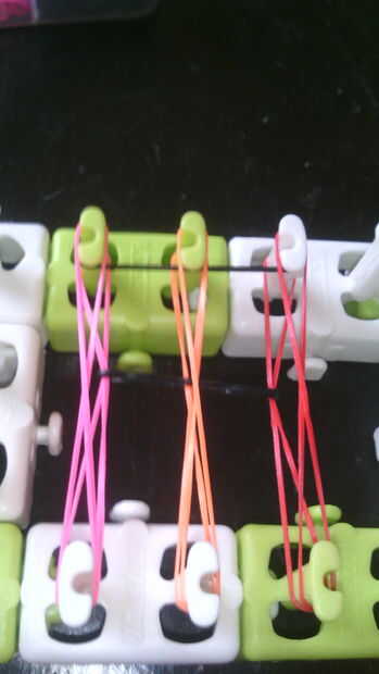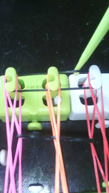 Paso 1: Comenzar la pulsera Primero usted tiene que asegurarse de que las flechas de su telar son hacia arriba y poner las bandas en el lado derecho hacia arriba y hacerlo hasta que la izquierda derecha y centro se llenan de bandas. Pero no las clavi