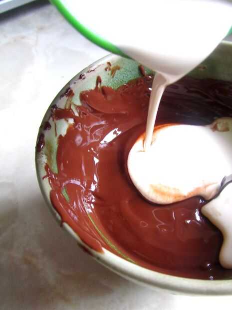 Una vez que el chocolate se haya derretido, vierta la crema doble. Revolver la mezcla bien, hasta que se espesa y brillante.