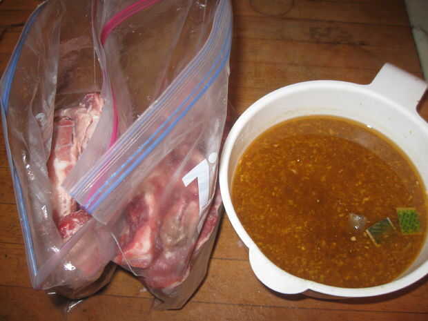 Después de las costillas han marinado como largo como sea posible, sacar la carne y secar con toalla de papel, quitando cualquier exceso de adobo