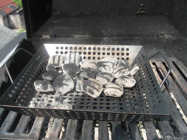 Si usted tiene un encendedor para chimenea de carbón lujo, usarlo y obtener el carbón de leña ardiente. Si usted es como yo y no tiene un arranque de lujo, siempre puede obtener el carbón ardiente con la parrilla de gas. Todo lo que necesitas hacer es descarga el carbón en un pan de barbacoa (uno que tiene agujeros), la luz la parrilla y espere a que el carbón esté gris e incinerados sobre y listo para ir. He encontrado que 10 minutos en alta funcionó apenas muy bien.