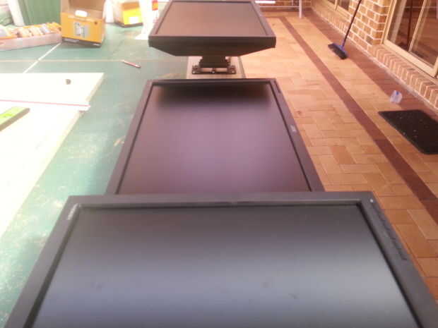 esto es un montaje barato, extremadamente robusto, ajustable, triple monitor. Abajo hay una lista de componentes necesarios para construir uno que hice. El Monte puede personalizarse para adaptarse a cualquier tamaño de monitor deseado. Esta configur