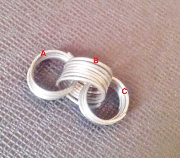 Ahora viene la parte difícil. Yo he marcado los anillos 'A', 'B' y 'C'. Ahora tienes a entwine 'C' a 'A', manteniendo en 'B'. Es como la adición de llaves :-) sólo asegurándose de que las otras teclas no escurrir mientras añades cada tecla!