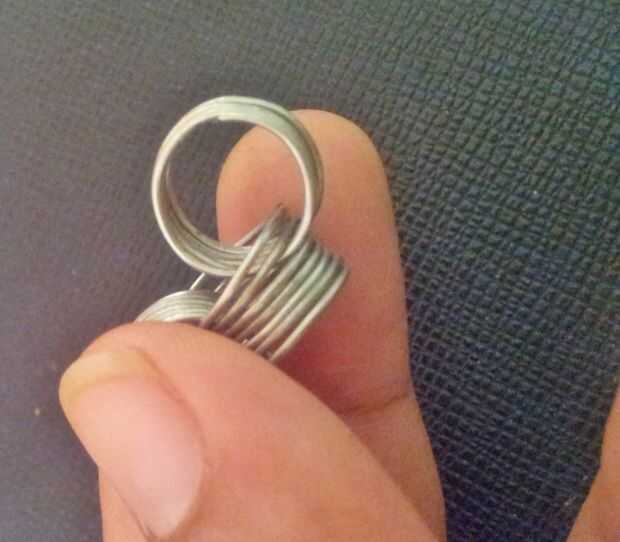 Ahora gire 2 de los anillos como un llavero para que esta entrelazado. Gire el tercer anillo demasiado y unirse a los 3.