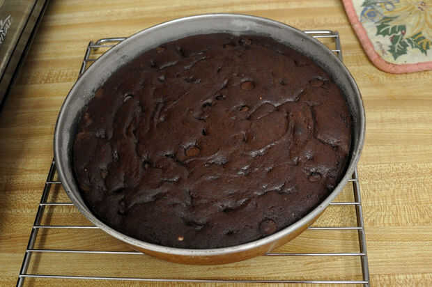 Transferencia de la torta de la bandeja sobre una rejilla para enfriar, puede tomar una leve explosión del recipiente para liberar. Luego levante el lado derecho de la torta en la bandeja de enfriamiento para que no ensucie encima de la parte superior. Solo usé mi extensión mano para esto.